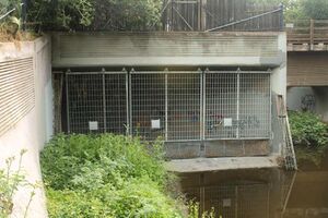 The two main entrances to the Gunnels used by students are at the debris basin and at Matadero Creek, just beyond the Barron Park Donkeys. Both are sealed by a grate which has been pried open.